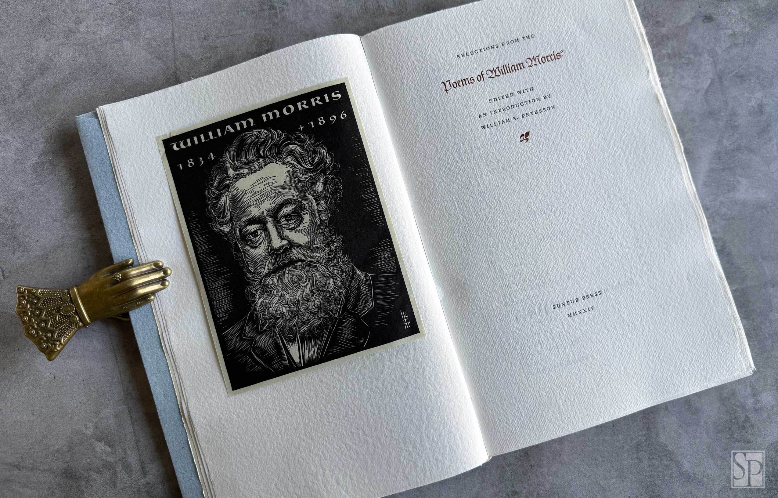 - Frontispiece portrait of William Morris drawn by Hermann Zapf in 1948 and hand-engraved in lead by August Rosenberger; printed from the original metal electrotype plate used in 1949.