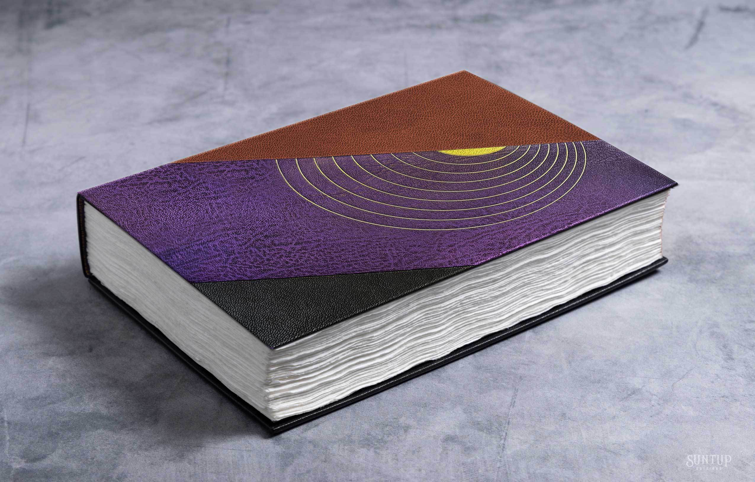 - Volume I is bound in black leather with large onlays of smooth black leather, and textured black, brown and purple leathers. The black section is designed to represent Inferno, with the brown and purple sections representing Purgatorio and Paradiso respectively. The design is tooled using candle soot, palladium leaf and gold leaf. Part of the gold is surface gilt, a little known technique used to cover areas of leather in gold and other types of leaf. The top-edge is gilt with gold leaf and the head and tail bands are hand tied with brown, purple and gold silk, reflecting the colors of the onlays. The pastedowns are handmade decorative papers using acrylic paints and gold leaf. The natural deckle of the paper has been maintained at the fore- and lower-edge.